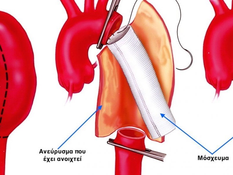 Θεραπεία: Συντηρητική: – Συνιστάται περιοδική παρακολούθηση με τη διενέργεια υπερηχοτομογραφικού ελέγχου σε ανευρύσματα με διάμετρο μικρότερη των 5 εκ. – Χειρουργική: συνιστάται όταν – το ανεύρυσμα είναι μεγαλύτερο των 5 εκ. – όταν κατά το χρόνο της παρακολούθησης το μέγεθος του αυξάνεται ταχέως. – Ανοιχτή χειρουργική επέμβαση: Γίνεται τομή στην κοιλιακή χώρα υπό γενική αναισθησία και αντικαθίσταται η ανευρυσματική αορτή με συνθετικό μόσχευμα. Ανάγκη για παραμονή τα πρώτα εικοσιτετράωρα στην εντατική θεραπεία με μακρό χρόνο νοσηλείας και αποθεραπεία. Πολύ καλά μακροπρόθεσμα αποτελέσματα. – Ενδοαυλική αποκατάσταση. Με μικρές τομές στις μηροβουβωνικές πτυχές, συνήθως με τοπική αναισθησία τοποθετείται ενδοαυλικό μόσχευμα stent. Με τη μέθοδο αυτή ο ασθενής επιβαρύνεται λιγότερο και έχει άμεση αποκατάσταση και υπάρχει δυνατότητα αντιμετώπισης ασθενών με προβλήματα υγείας. Τα μακροπρόθεσμα αποτελέσματα της μεθόδου είναι άγνωστα λόγω του μικρού χρόνου εφαρμογής της μεθόδου. Η επιλογή της θεραπευτικής αγωγής επηρεάζεται από ορισμένους παράγοντες: – Μέγεθος ανευρύσματος – Ηλικία – φύλο – Συνυπάρχοντα προβλήματα υγείας που επιβαρύνουν τον ασθενή – Δυνατότητες νοσηλευτικού κέντρου – Εμπειρία θεράποντος ιατρού – Κόστος.